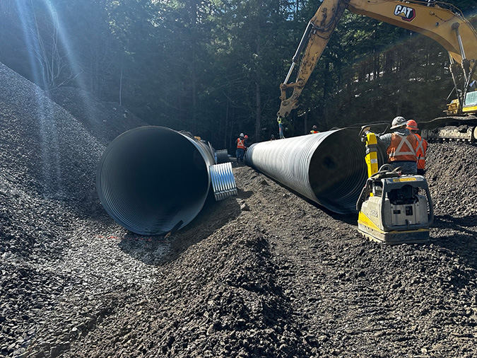 Crews also installed two larger culverts to handle future runoff and reduce the chances of future blockages by debris. They then compacted and buried the culverts, rebuilt the rail grade and prepared the site for new track.
